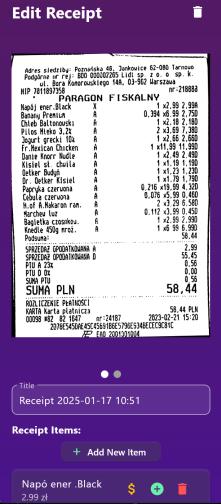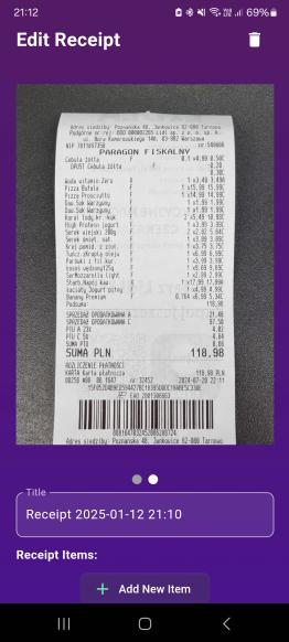 Celem pracy było opracowanie aplikacji mobilnej umożliwiającej archiwizację zdjęć paragonów oraz wspierającej analizę wydatków. W aplikacji zaimplementowano funkcje automatycznego wykrywania i rozpoznawania tekstu z obrazów paragonów, z wykorzystaniem splotowych (CNN) i rekurencyjnych sieci neuronowych (RNN) z naciskiem na jej specyficzny typ LSTM (Long Short Term Memory). System pozwala także na ręczne wprowadzanie danych z istniejących plików graficznych oraz ręczną korektę ewentualnych błędów w rozpoznaniu tekstu spowodowanych niedokładnościami technologii OCR.